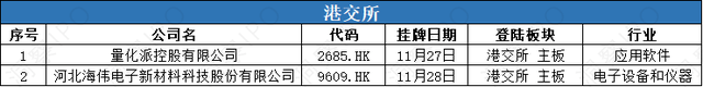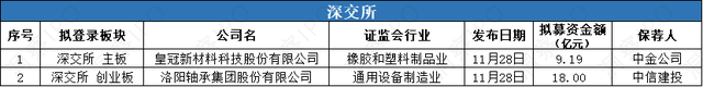 11月25日-12月1日,所科创板有1家公司递交上市申请;深交所从板有1家公司递交上市申请,创业板有1家公司递交上市申请。