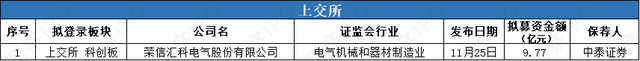 11月25日,荣信汇科电气股份无限公司(以下简称“荣信汇科”)沪市科创板IPO获受理,保荐机构为国金证券。